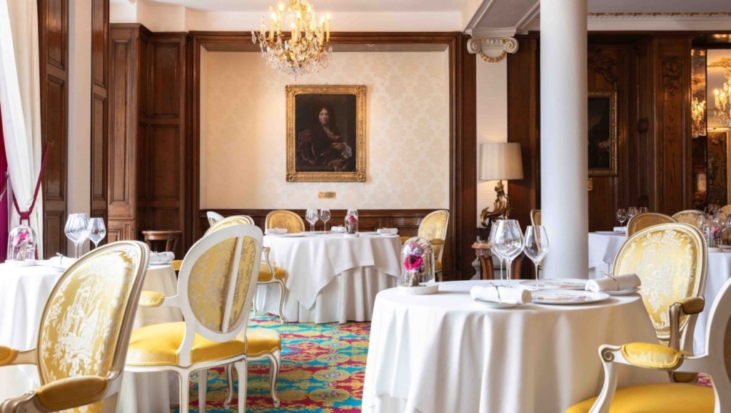 L’hôtel abrite plusieurs espaces de restauration, et chacun possède une atmosphère si distincte qu’il serait réducteur de les regrouper sous une même enseigne. Le Chantecler, restaurant gastronomique, développe une cuisine raffinée dans un décor XVIIIe où boiseries sculptées et toiles anciennes composent un cadre à la hauteur de l’assiette. À quelques pas, La Rotonde adopte un registre plus vivant, presque pop, avec ses chevaux de carrousel et ses couleurs franches qui en font l’un des espaces les plus surprenants de l’établissement.