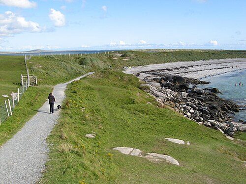 Sous ces latitudes, une eau turquoise et un sable blanc ont de quoi surprendre. Dog’s Bay forme un tombolo avec la plage de Gurteen Bay : les deux anses se font face, dos à dos, séparées par un isthme de sable. Ce sable particulier est composé en grande partie de fragments de coquillages et de coraux brisés, ce qui lui donne cette teinte claire et cette texture soyeuse. Le résultat visuel est une plage qui ressemble davantage à ce qu’on attendrait dans le golfe du Mexique qu’en Irlande occidentale.