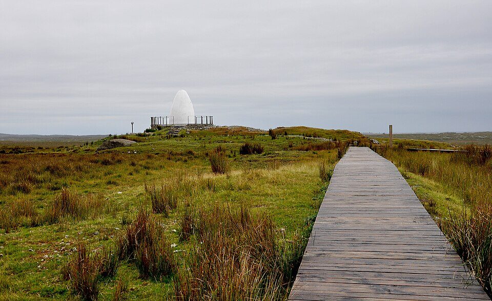 Rares sont les endroits au monde qui peuvent se vanter d’avoir changé deux fois le cours des communications mondiales. À 4 kilomètres au sud de Clifden, dans une étendue de tourbière basse que les moutons traversent en silence, deux faits d’histoire absolument extraordinaires se sont produits. En 1907, l’inventeur italien Guglielmo Marconi y installe la première station radio transatlantique permanente du monde, et transmet depuis cet endroit reculé le premier signal commercial vers l’Amérique. Le 15 juin 1919, douze ans plus tard, à quelques centaines de mètres de là, les aviateurs britanniques John Alcock et Arthur Whitten Brown atterrissent en catastrophe dans ce même bog, au terme du premier vol transatlantique sans escale de l’histoire. Ils avaient décollé de Terre-Neuve 16 heures et 28 minutes plus tôt, sur un biplan Vickers Vimy.